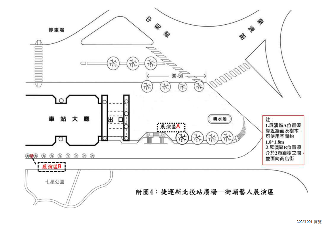 ●街頭藝人請詳閱「臺北捷運公司提供街頭藝人展演空間及使用規範」(詳附件1、2),展演當日請務必先至車站詢問處簽到,並於離場前至車站詢問處簽退。